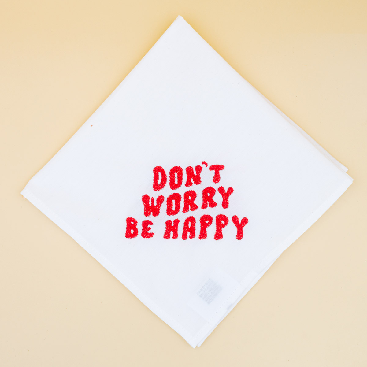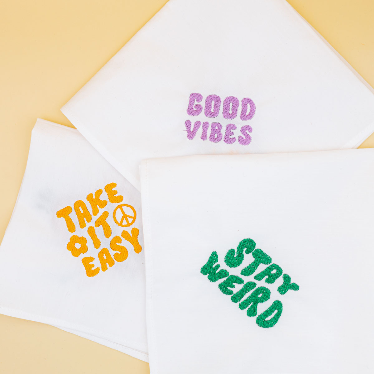 Le Messager est un mouchoir en tissu brodé pensé pour transmettre plus qu’un simple geste. Sur une belle toile de coton, chaque pièce porte un mot ou une phrase positive brodée avec une typographie rétro.